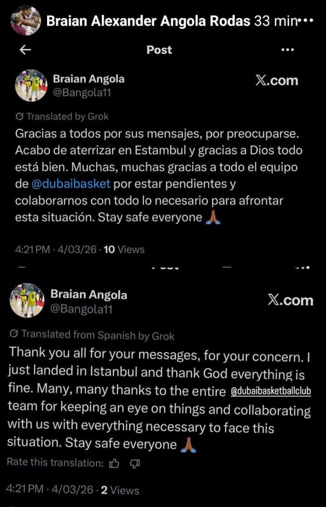 “Gracias a todos por sus mensajes, por preocuparse. Acabo de aterrizar en Estambul y gracias a Dios todo está bien. Muchas, muchas gracias a todo el equipo de @dubaibasket por estar pendientes y colaborarnos con todo lo necesario para afrontar esta situación. Stay safe everyone”, publicó Angola Rodas este miércoles en su cuenta de X, tras salir con éxito de la zona de influencia de los bombardeos de Irán contra los países árabes aliados de Estados Unidos.